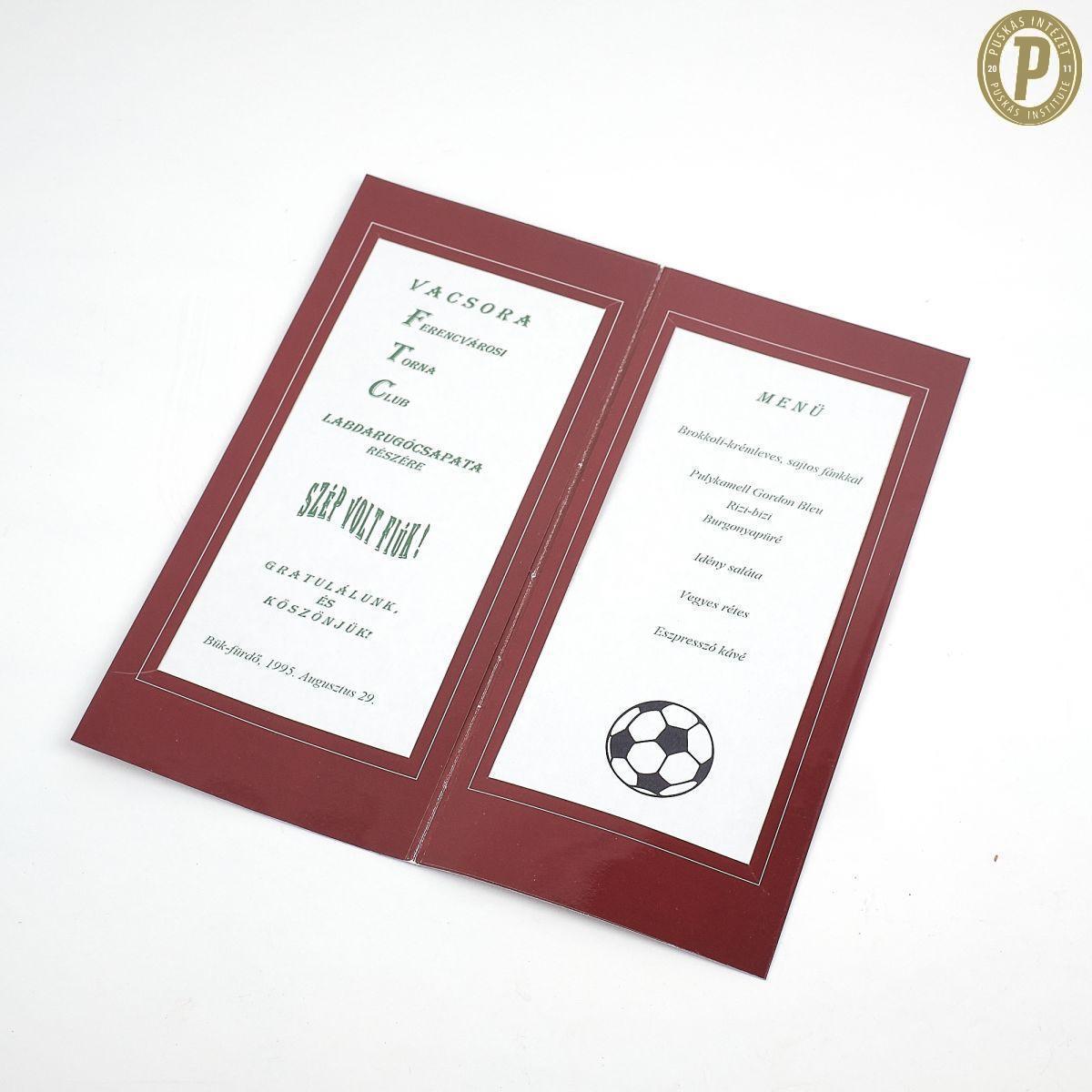 1995-ös FTC-menükártya. (Fotó: Puskás Intézet)