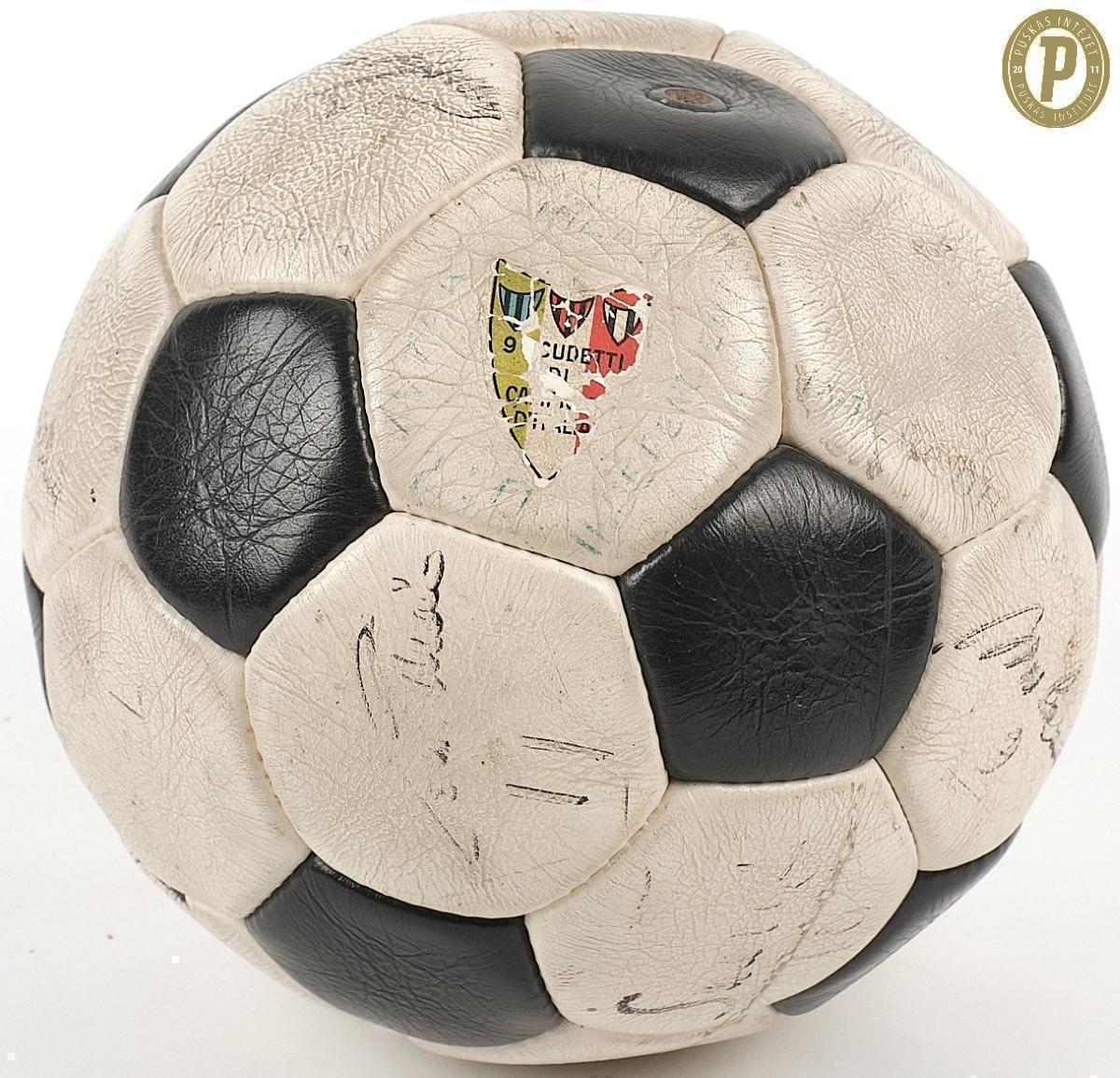 Az 1964. szeptember 23-i Világkupa-döntő, 2. mérkőzés: Inter–Independiente (2–0) dedikált meccslabdája (fotó: Puskás Intézet/Gere-hagyaték)
