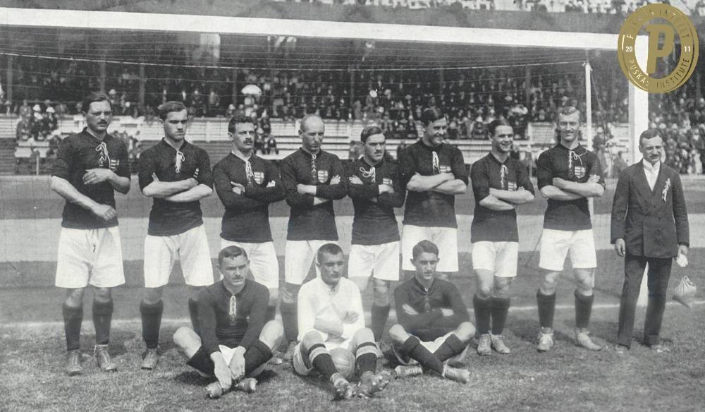 Az magyar labdarúgó-válogatott, amely legyőzte Németországot tétmérkőzésen, a fotó 1912-es olimpiai füzetből van (fotó: Puskás Intézet)