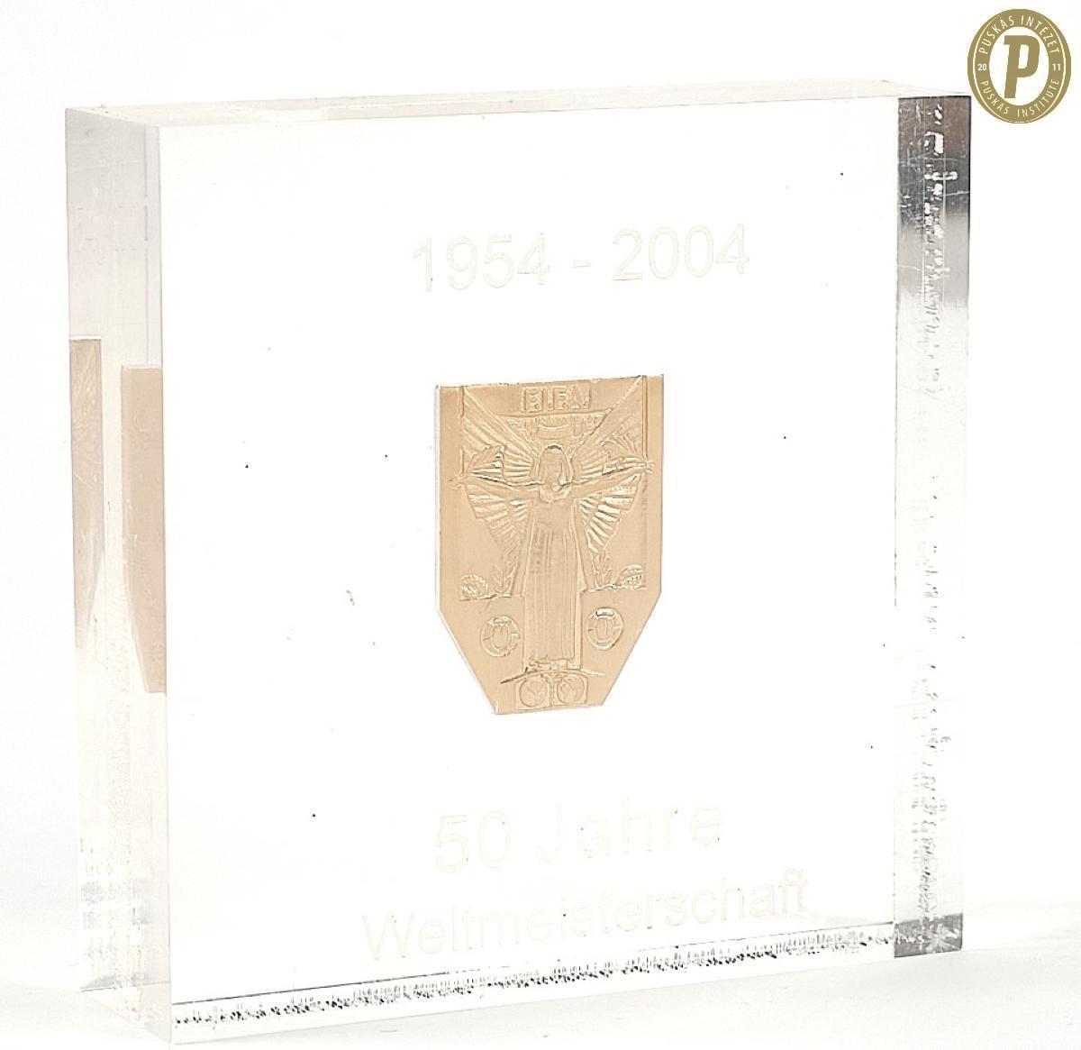 Puskás Ferenc világbajnoki aranyérme, amelyet Német Labdarúgó-szövetségtől kapott ajándékba az 1954-es vb-döntő 40. évfordulójára, 2004. (Fotó: Puskás Intézet/Puskás-hagyaték)