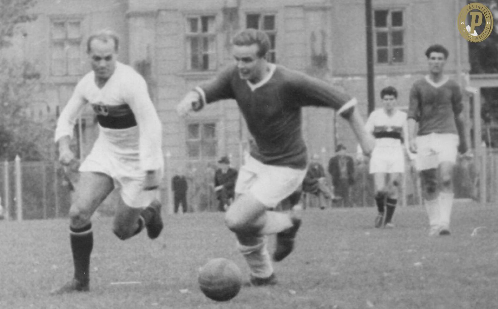 Buzánszky Jenő (fehér mezben) a Dorog játékosaként küzd a labdáért. (Fotó: Puskás Intézet/Buzánszky-hagyaték)