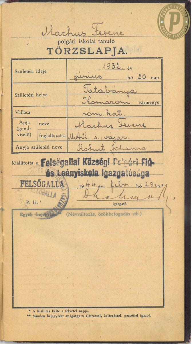 Machos Ferenc tanulmányi értesítője. (Fotó: Puskás Intézet)