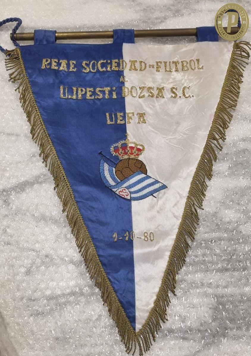 Az 1980. október 10-i Real Sociedad–Újpesti Dózsa SC (1–0) mérkőzésről a spanyol csapat zászlója (fotó: Puskás Intézet/Bene-hagyaték)