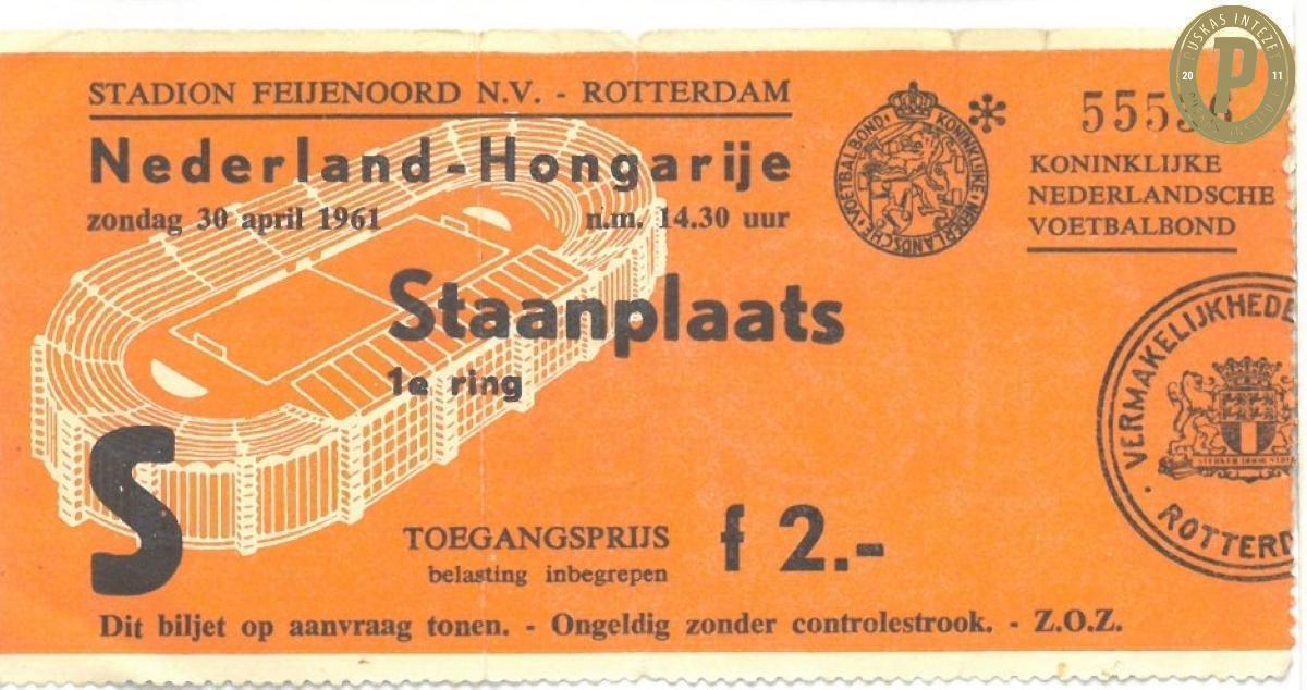Belépőjegy a két válogatott első tétmérkőzésére, vagyis az 1960. árpilis 30-i Hollandia–Magyarország (0–3) vb-selejtezőre (fotó: Puskás Intézet)