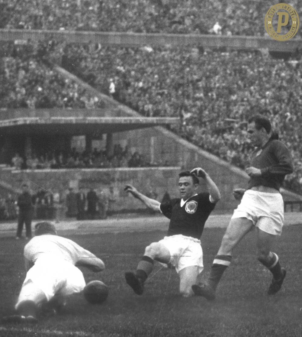 Hidegkuti Nándor (jobbra) az 1955. május 29-i Magyarország–Skócia barátságos mérkőzésen (fotó: Puskás Intézet)