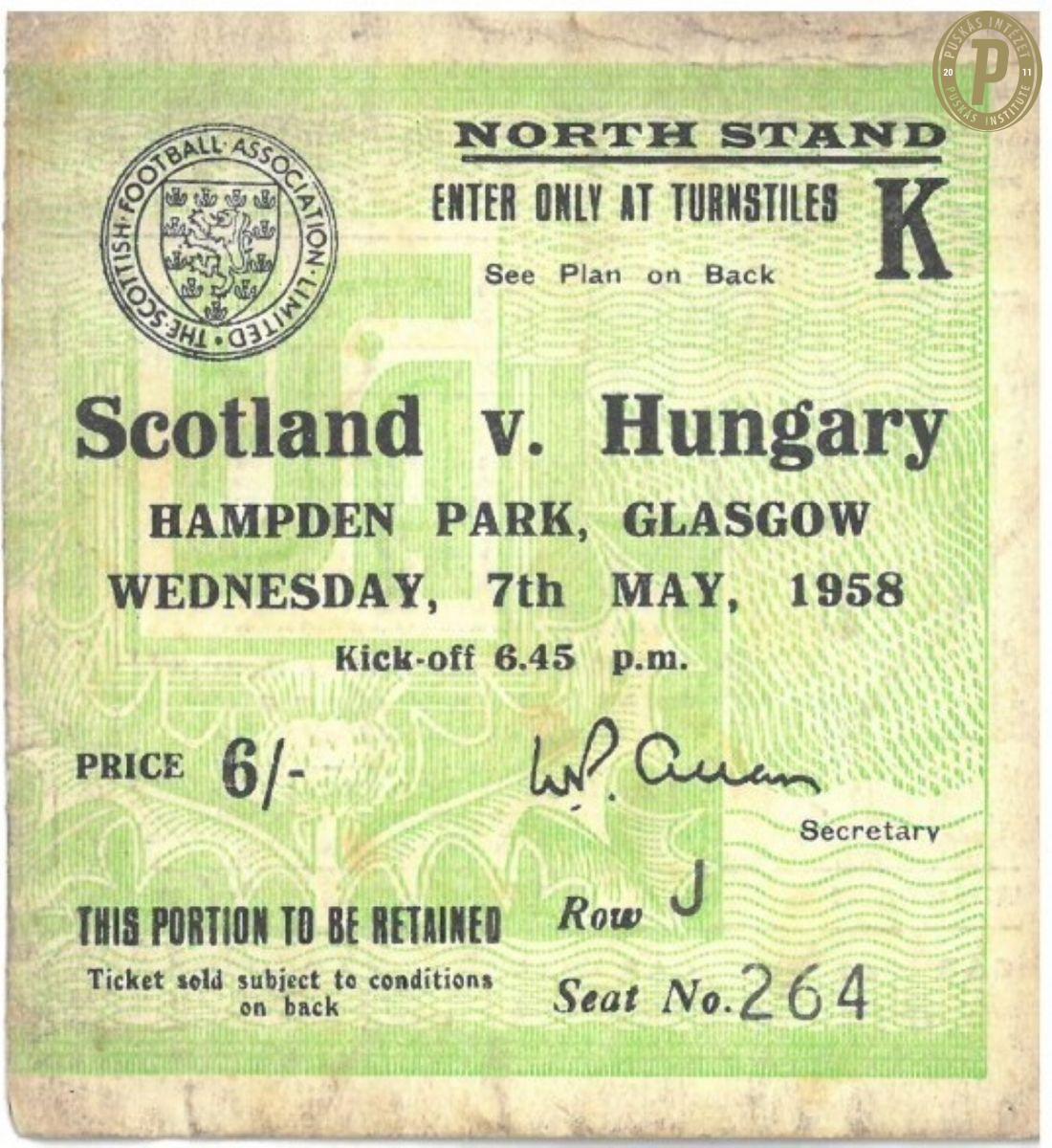 Belépőjegy az 1958. május 7-i Skócia–Magyarország barátságos mérkőzésre (fotó: Puskás Intézet)
