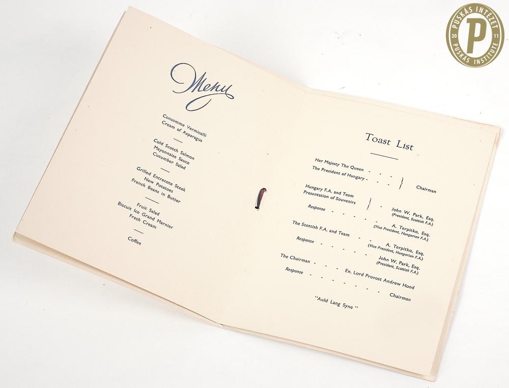 Menükártya az 1958. május 7-i Skócia–Magyarország barátságos mérkőzés utáni vacsoráról (fotók: Puskás Intézet)