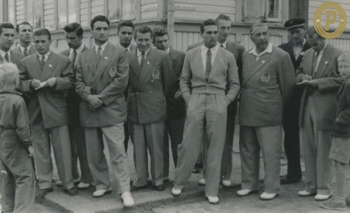 Az Aranycsapat labdarúgói az 1952-es magyar olimpiai egyenruhába aláírásokat osztogatnak (otó: Puskás Intézet)