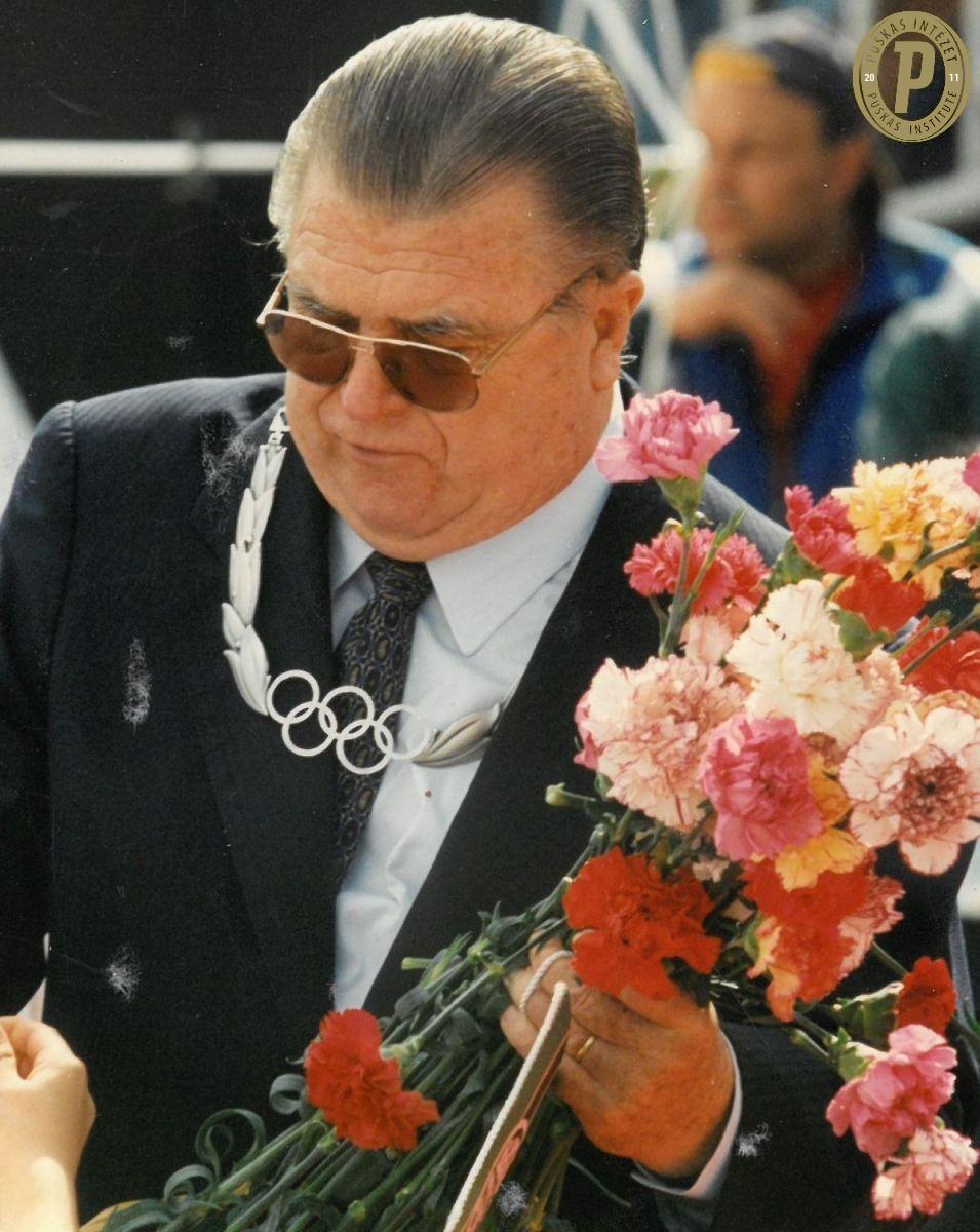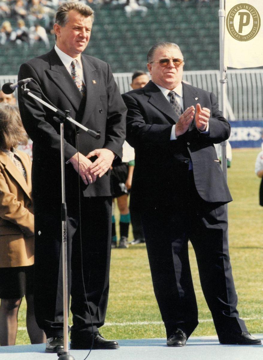 Olimpiai bajnokok egymás között: a Magyar Olimpiai Bizottság (MOB) elnöke (1989–2010) Schmitt Pál (balra) és Puskás Ferenc (jobbra) a Népstadionban 1997-ben a legendás magyar labdarúgó NOB-kitüntetésén (fotó: Puskás Intézet/Puskás-hagyaték)