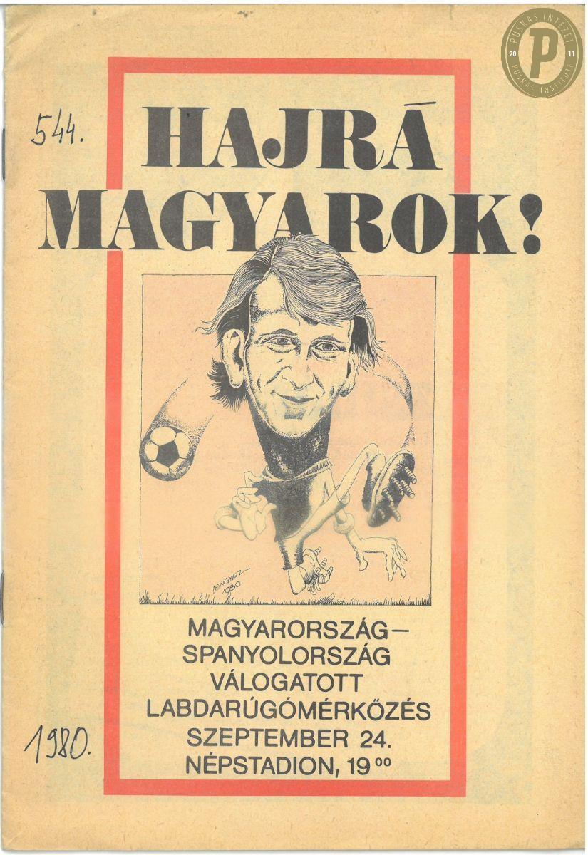 Az 1980. szeptember 24-i Magyarország–Spanyolország (2–2) barátságos mérkőzés porgramfüzete, Nagy László ezen a találkozón búcsúzott el a válogatottól, a 12. percben Pölöskei Gábor váltotta a Népstadionban. (Fotó: Puskás Intézet)