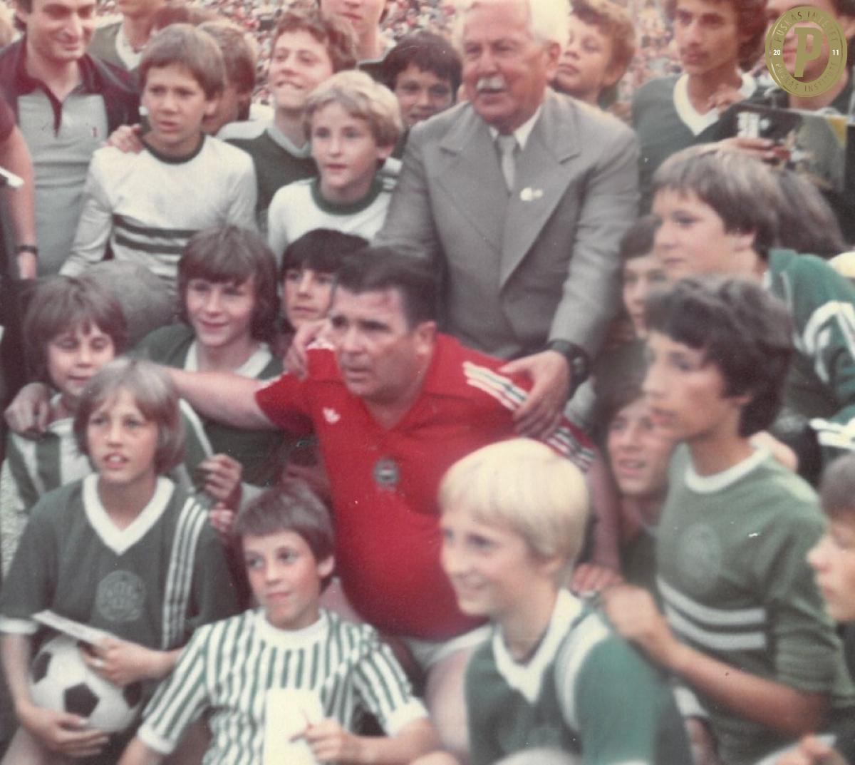 Puskás Ferenc a fradista labdaszedő gyerekekkel a Népstadionban (fotó: Puskás Intézet/Puskás-hagyaték)