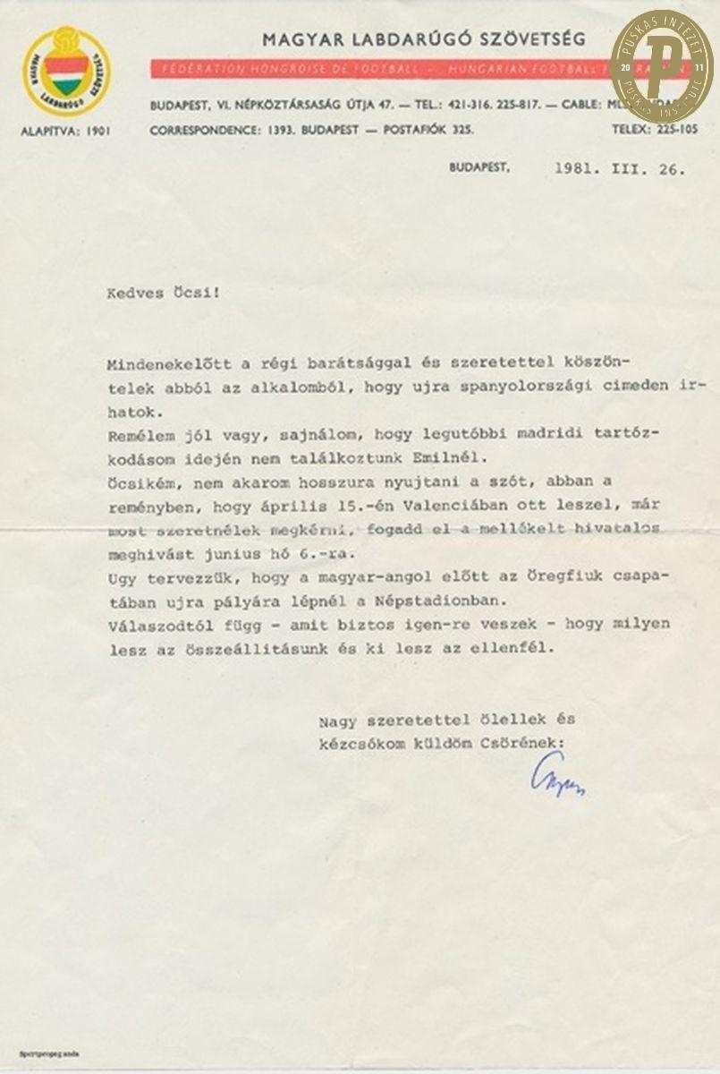 Szepesi György baráti levele Puskás Ferencnek (fotó: Puskás Intézet)