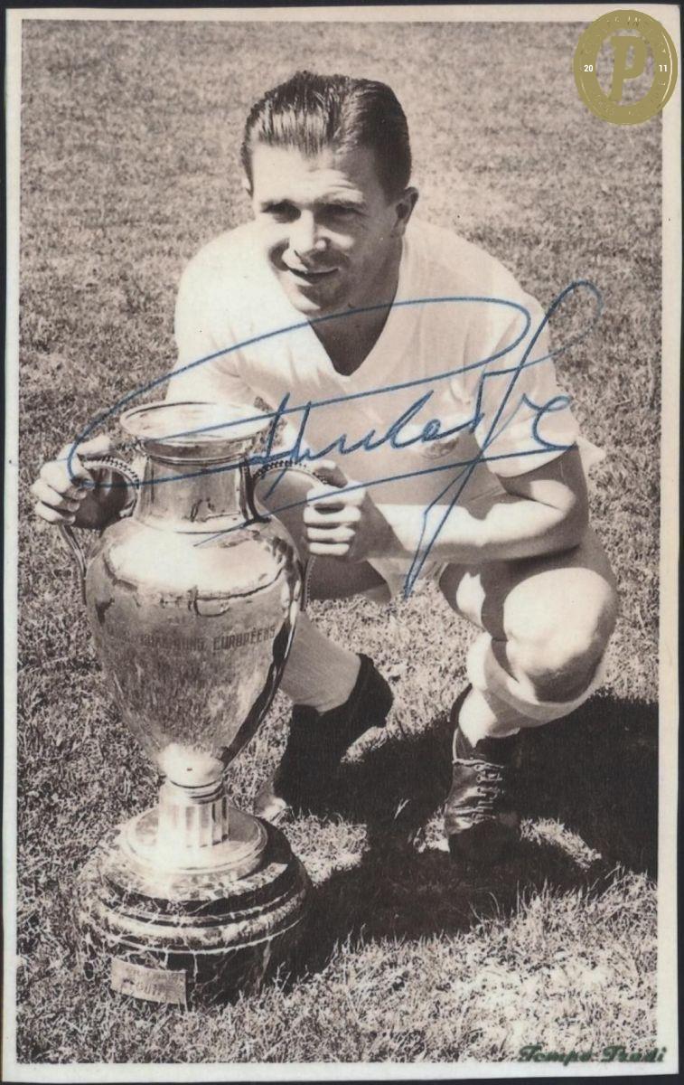 Puskás Ferenc a BEK-trófeával, aláírt fénykép (fotó: Puskás Intézet/Puskás-hagyaték)