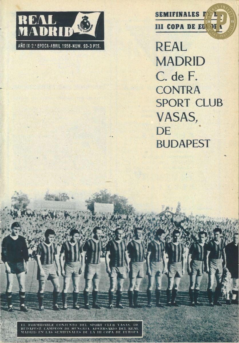 Az 1958. április 2-i Real Madrid – Vasas SC (4–0) BEK-elődöntő műsorfüzete. A spanyol sztáralakulat a BEK 1957–1958-as kiírásában a Vasas játszott az elődöntőben, az első mérkőzésen a Real Madrid nyert négy góllal, de visszavágón a Vasas győzött 2–0-ra a Népstadionban. A kupasorozatot aztán a Real Madrid nyerte meg, miután hosszabbításban 3–2-re legyőzte az AC Milant a döntőben. (Fotó: Puskás Intézet)