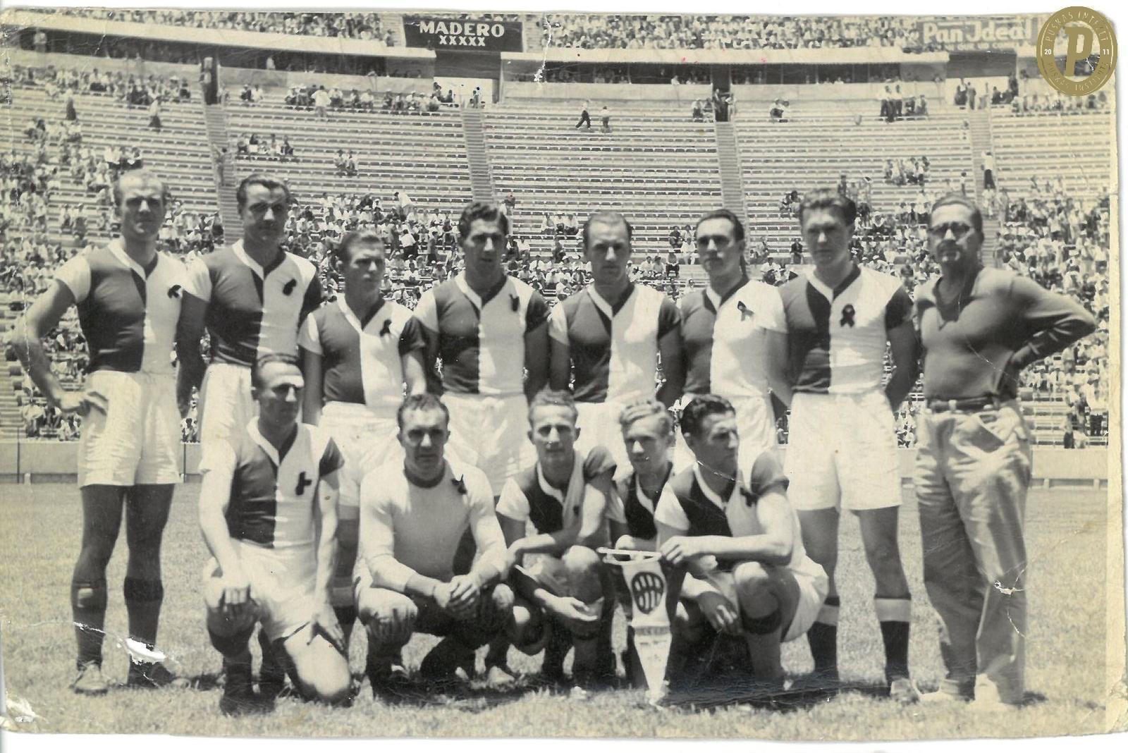 A Ferencváros csapata az 1947-es mexikói tornán. Álló sor (balról jobbra): Csanádi Árpád, Kispéter Mihály, Puskás Ferenc, Rudas Ferenc, Ónody I. Andor, Hernádi Pál, Szusza Ferenc, Opata Zoltán (edző). Első sor (balról jobbra): Kéri Kálmán, Csikós Gyula, Mészáros József, Lakat Károly, Sárosi György (fotó: Puskás Intézet/Puskás-hagyaték)