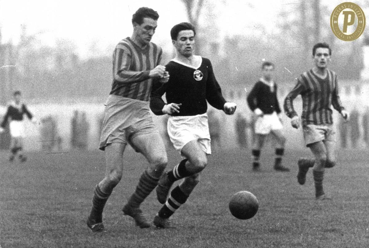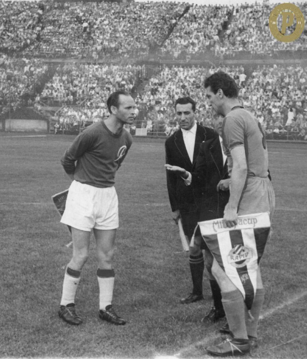 Szilágyi Gyula, a Vasas csapatkapitányaként (jobbra) az 1956-os Közép-európai Kupa-döntőbe 3. mérkőzésén, a Rapid Wien ellen a Népstadionban. (Fotó: Puskás Intézet)
