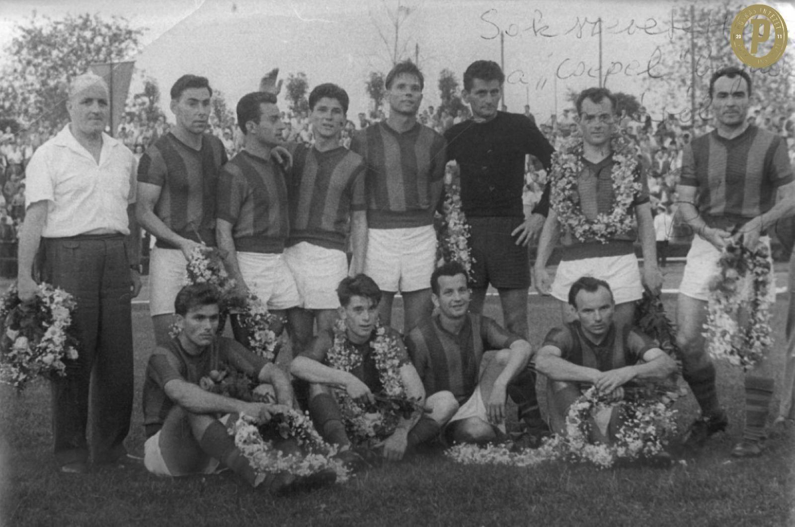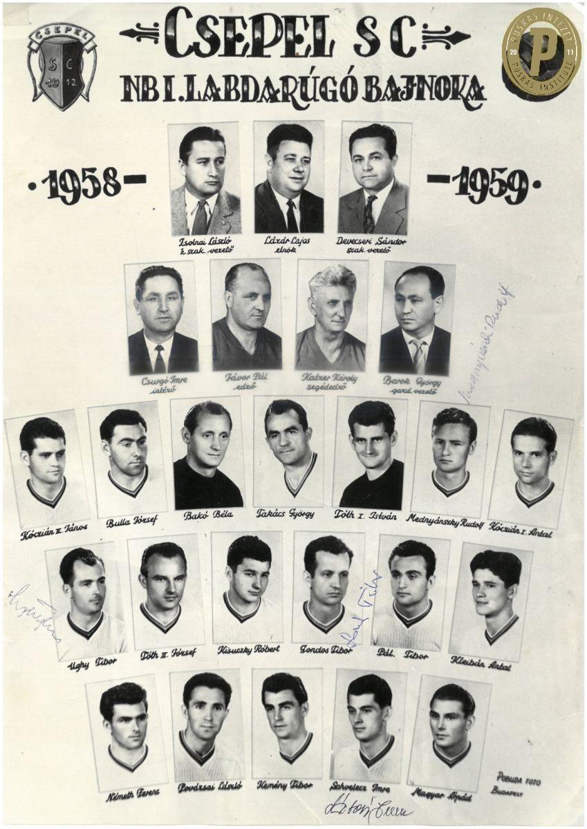 A Csepel SC bajnokcsapata az 1959. június 21-i Csepel–Ferencváros (1–1) NB I-es mérkőzés után. Felső sor (balról jobbra): Jávor Pál vezetőedző, Bulla József, Pál Tibor, Kleibán Antal, Kóczián Antal, Tóth I István, Ughy Tibor, TAKÁCS GYÖRGY. Alsó or (balról jobbra): Németh Ferenc, Sátori Imre, Gondos Tibor és Tóth II József. (Fotó: Puskás Intézet/Tóth II-hagyaték)