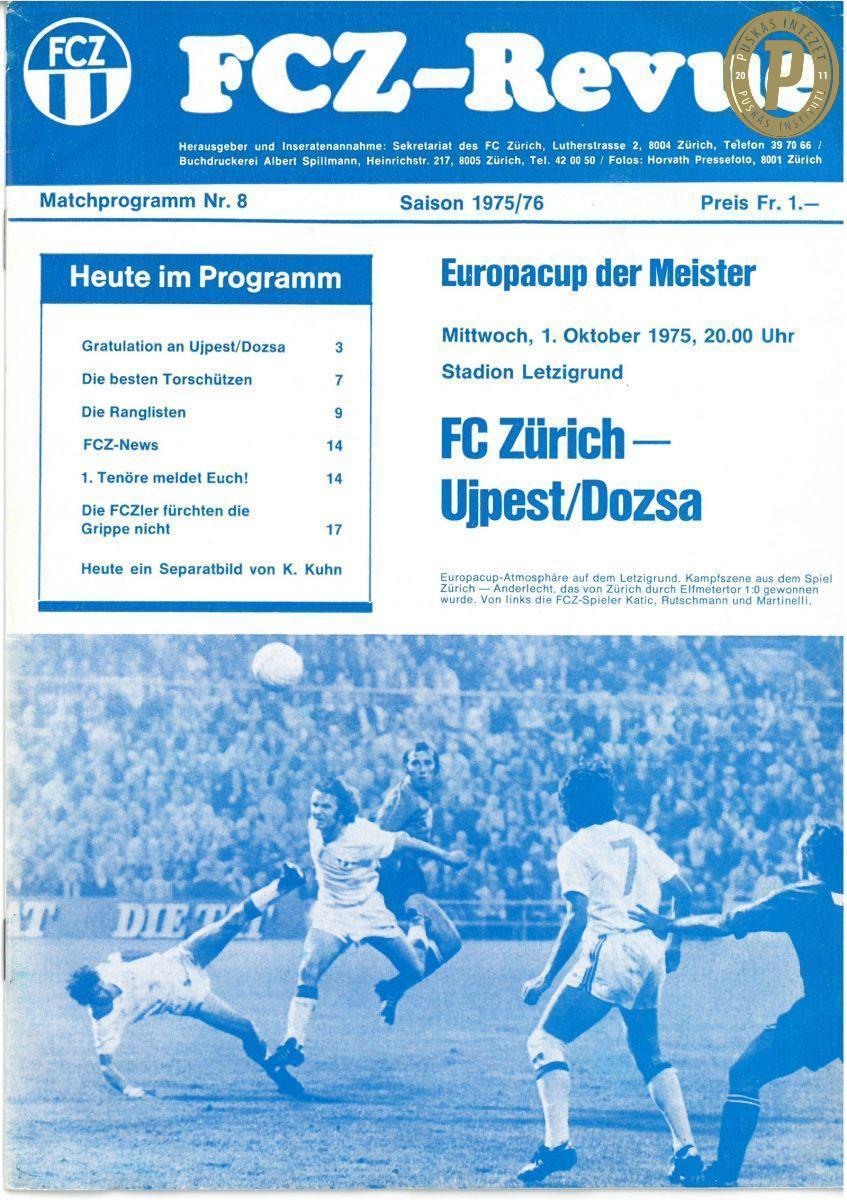 Az 1975-ös FC Zürich – Újpest Bajnokcsapatok Európa-kupája mérkőzés műsorfüzete. (Fotó: Puskás Intézet)