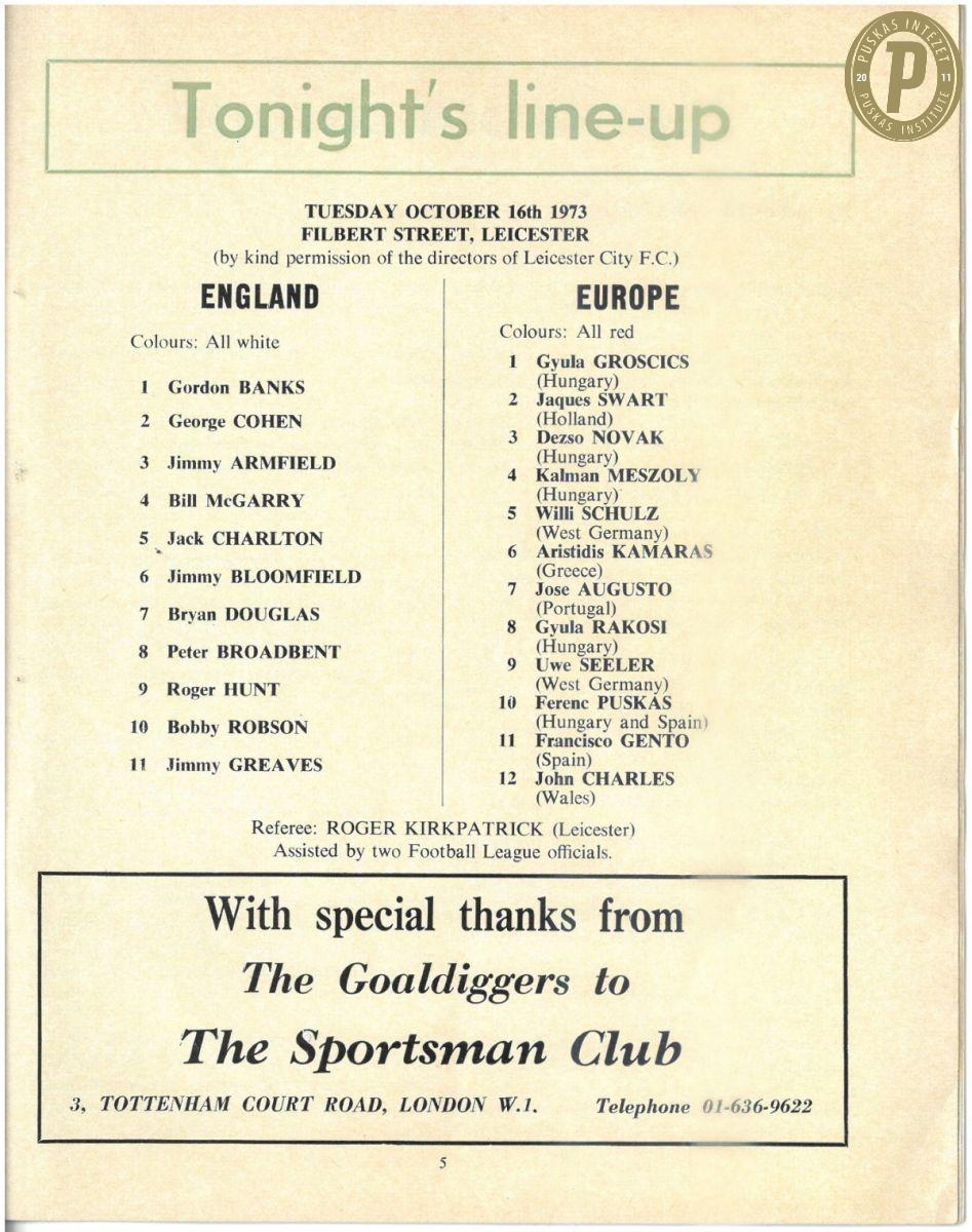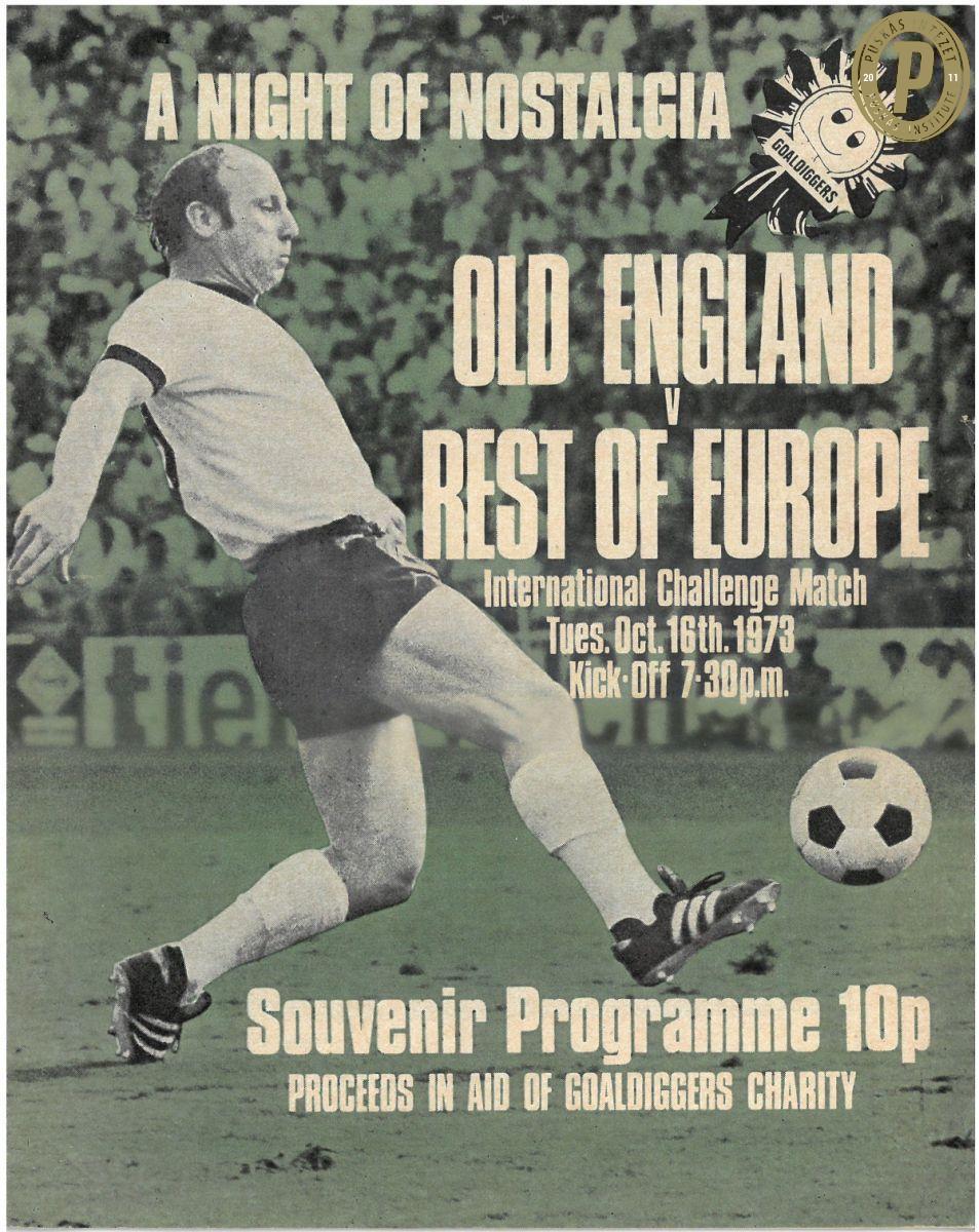 Az 1973. október 16-i Angol Öregfiúk Válogatott – Európai Öregfiúk Válogatott gálamérkőzés műsorfüzete – a gálameccsen Grosics Gyula, Novák Dezső, Puskás Ferenc és Rákosi Gyula is pályára lépett (fotó: Puskás Intézet)