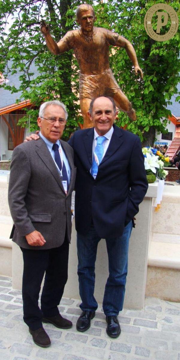 Amacio, a Real Madrid egykori tiszteletbeli elnöke és az utódja, Pirri Puskás Ferenc szobránál, amelyet a stadionavató előtt lepleztek le (fotó: Puskás Intézet)