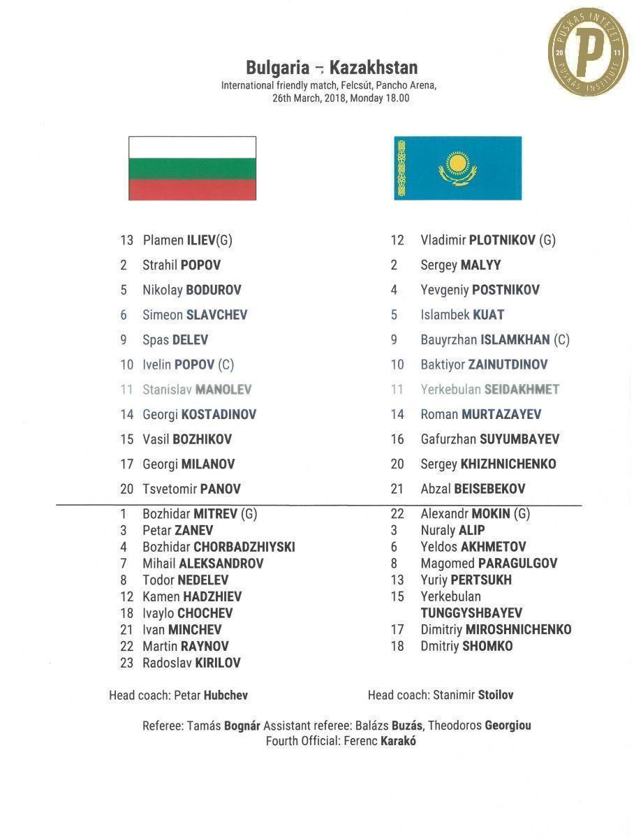 A 2018. március 26-i Bulgária–Kazahsztán (2–1) barátságos mérkőzés hivatalos kezdőcsapatai (fotó: Puskás Intézet)