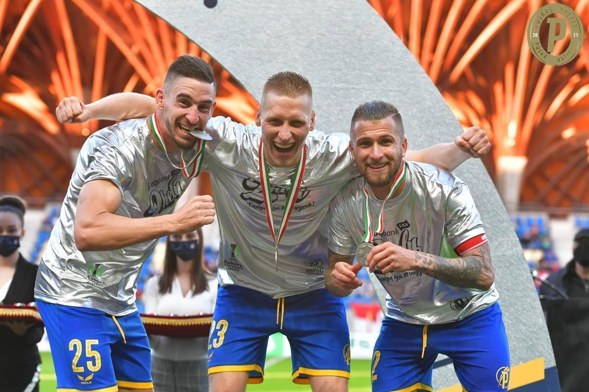 A Puskás-akadémisták: Nagy Zsolt, Spandler Csaba és Szolnoki Roland 2021. május 9-én az NB I-es ezüstérmek kiosztásakor a Pancho Arénában. Ez a PAFC történetének eddigi legjobb bajnoki helyezése. (Fotó: www.puskasakademia.hu)