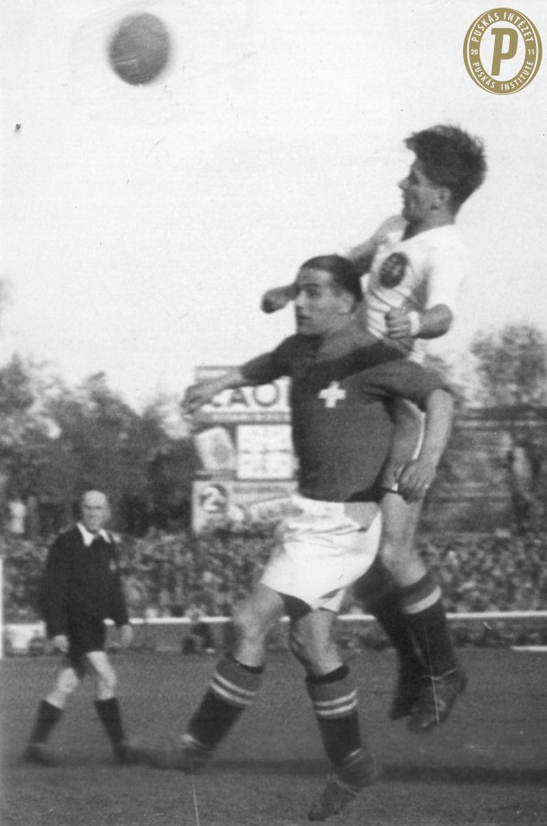 Gőcze Sándor (fehér mezben) fejeli el a labdát az 1948. április 21-i Magyarország–Svájc (7–4) Európa-kupa-mérkőzésen. Gőczének ez volt az első válogatottsága és a 42. percben az ő góljával alakult 3–3-ra az állás. (Fotó: Puskás Intézet)