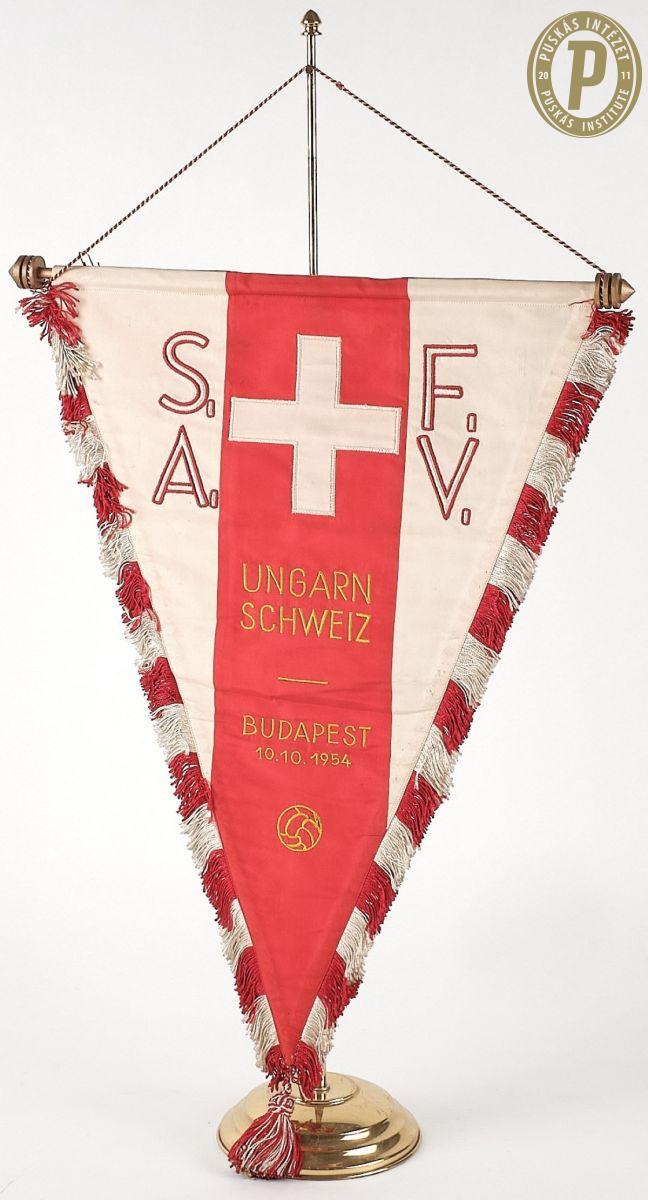 Svájci csapatzászló az 1954. október 10-i Magyarország–Svájc (3–0) barátságos mérkőzésről (fotó: Puskás Intézet/Puskás-hagyaték)