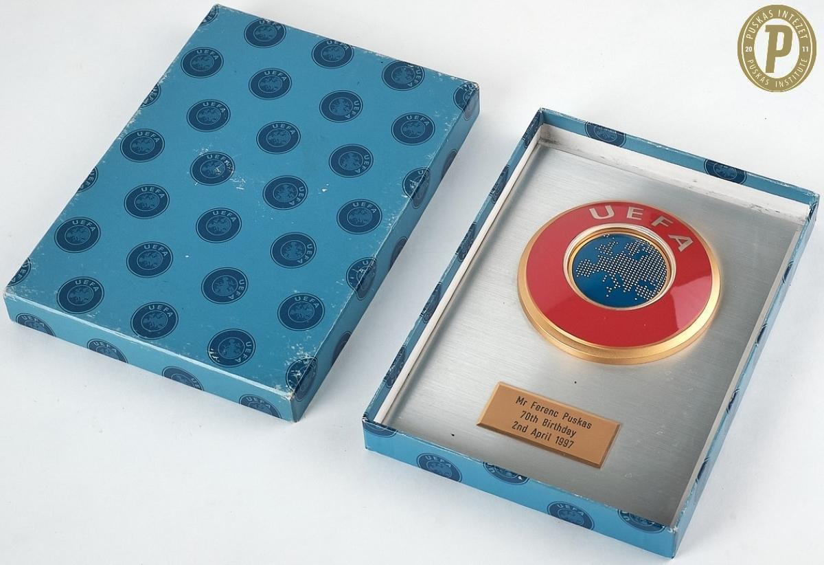 Puskás Ferenc UEFA-tól kapott ajándéka a 70. születésnapjára, 1997 (fotó: Puskás Intézet/Puskás-hagyaték)
