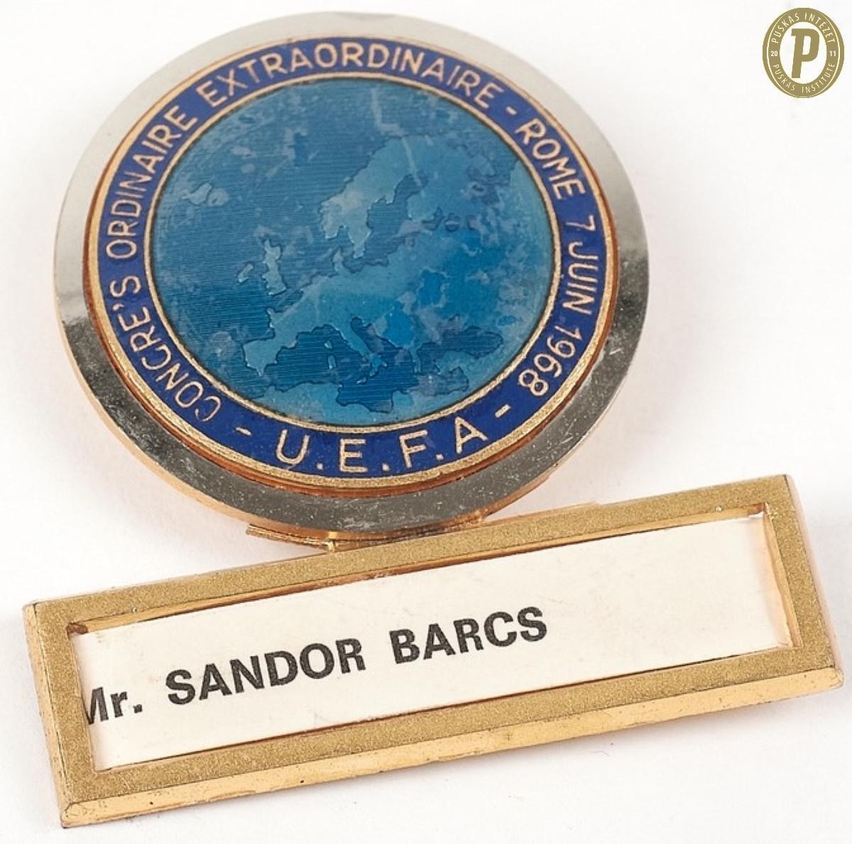 Barcs Sándor magyar sportvezető UEFA-kongresszusi kitűzője (fotó: Puskás Intézet)