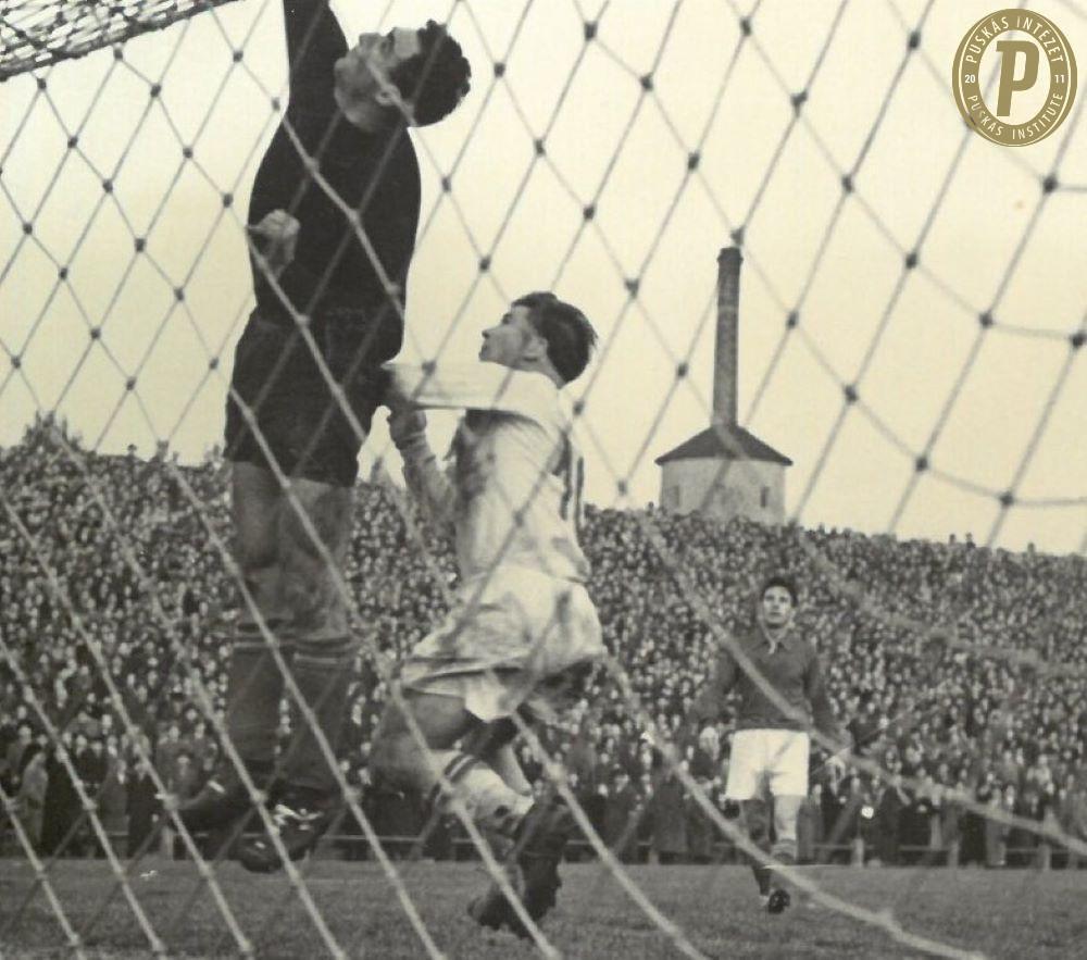NB I-es mérkőzés, Gellér Sándor előzi meg Puskás Ferencet, a háttérben Zakariás József figyel (fotó: Puskás Intézet/Gellér-hagyaték)