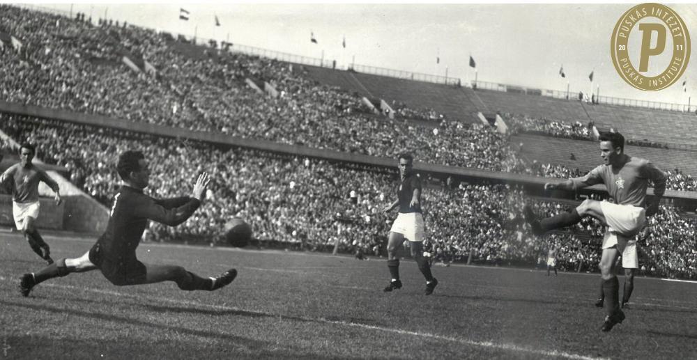 Gellér Sándor fogja a labdát az 1951. október 7-i Bp. Bástya – Vasas (3–2) NB I-es mérkőzésen (fotó: Puskás Intézet/Gellér-hagyaték)