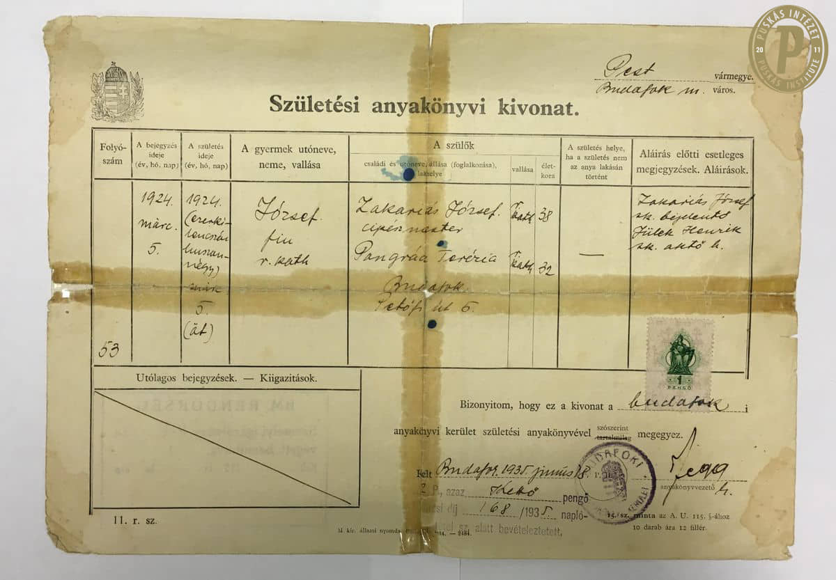A klasszikus Aranycsapat-tagok közül elsőként Zakariás József távozott 1971. november 22-én, alig negyvenhét évesen. A Puskás Intézet több relikviát is őriz a hajdani legendás játékos hagyatékából.
